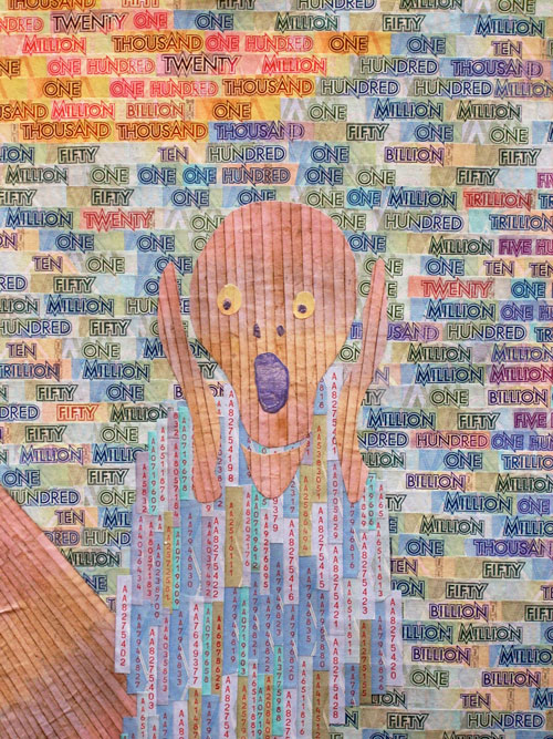 demonetised hyperinflation banknotes (ZWR $1,801,056,888,698,080), 24 carat gold leaf, and acrylic medium on paper